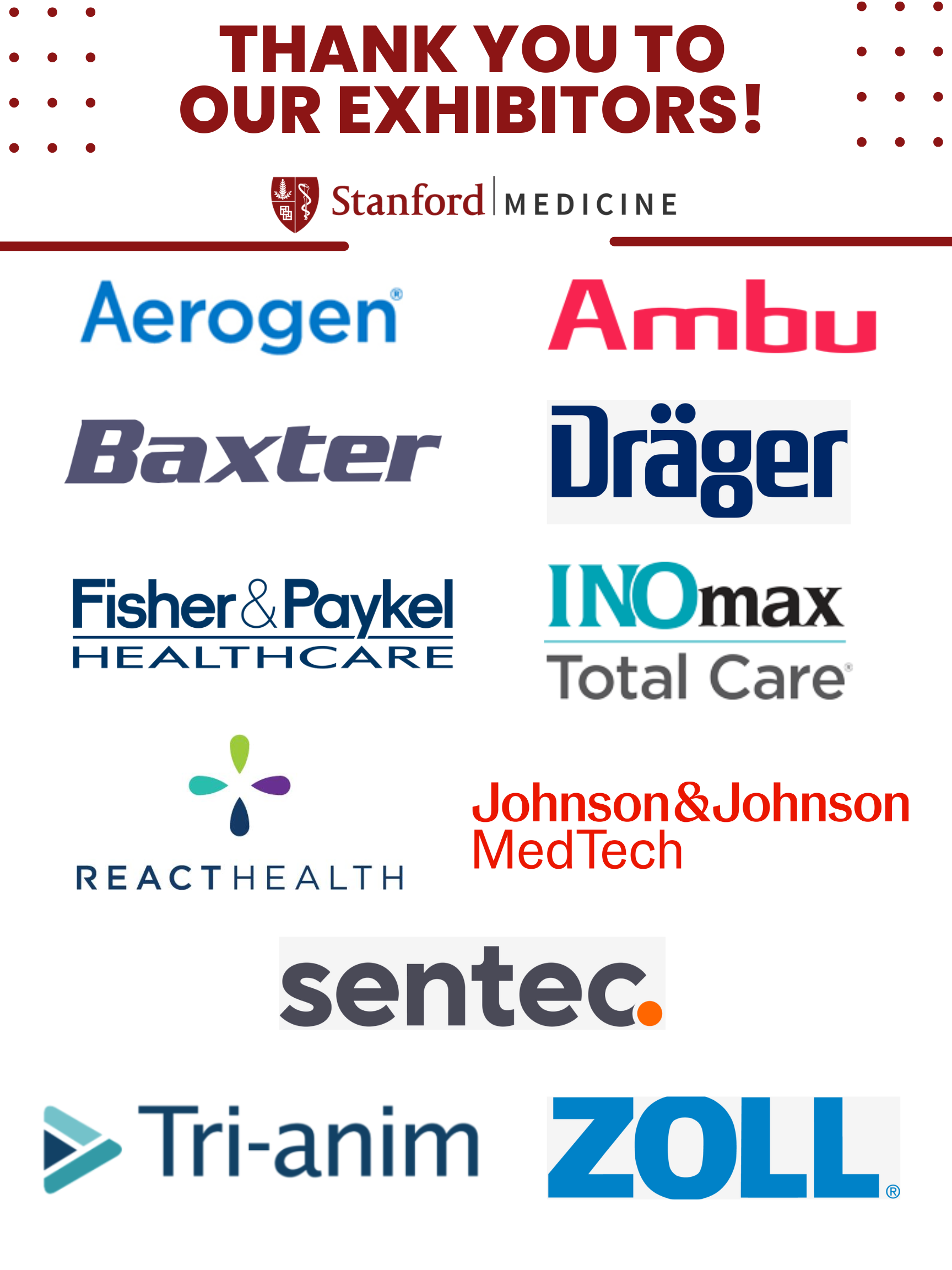 Exhibitors/Sponsors and Stanford CME agree to abide by the ACCME Standards for Integrity and Independence in Accredited Continuing Education, Stanford Medicine Industry Interactions Policy and Stanford CME Promotional Support Policy. Any actions that are not in accordance with the above stated policies may result in the removal of the exhibit/sponsor company and its representatives from the conference site, in which case no refund of exhibit/sponsor fees will be allowed.