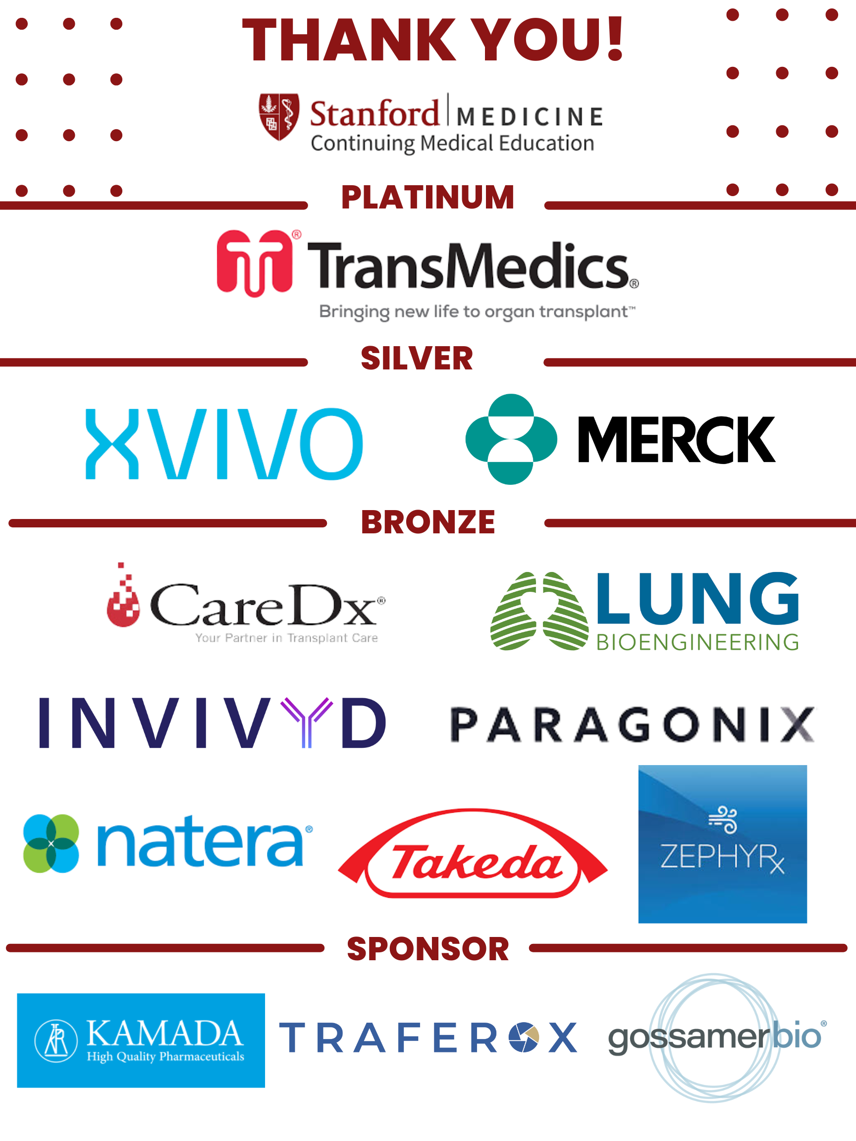 Exhibitors/Sponsors and Stanford CME agree to abide by the ACCME Standards for Integrity and Independence in Accredited Continuing Education, Stanford Medicine Industry Interactions Policy and Stanford CME Promotional Support Policy. Any actions that are not in accordance with the above stated policies may result in the removal of the exhibit/sponsor company and its representatives from the conference site, in which case no refund of exhibit/sponsor fees will be allowed.